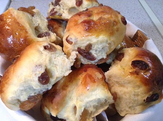 Αν μας κολλάει η ζύμη ρίχνουμε λίγο ακόμα αλεύρι όχι πολύ να μην σκληρύνει η ζύμη μας ίσα να ξεκολλήσει από τα χέρια και να γίνει μαλακή και αφράτη. Αφήνουμε να φουσκώσει πατάμε τη ζύμη μας και ρίχνουμε τις σταφίδες. Ζυμώνουμε λίγο ακόμα πλάθουμε μπαλάκια τα τοποθετούμε σε ταψί με αντικολλητικό χαρτί και αφήνουμε μισή ώρα να φουσκώσουν. Αλείφουμε με τον κρόκο αραιωμένο με λίγο νεράκι και ψήνουμε στους 180-190 βαθμούς για 20 λεπτά!!! Καλή επιτυχία !!!